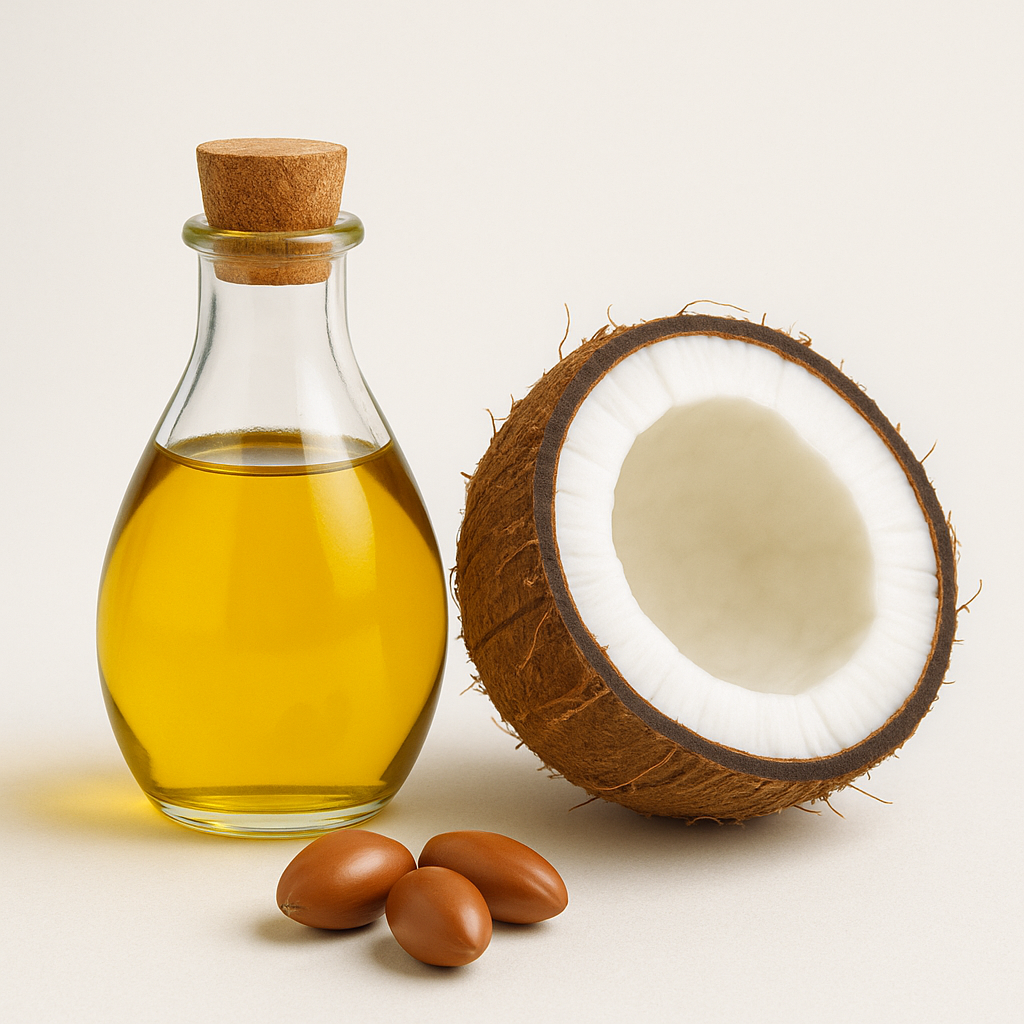 Rich in fatty acids and vitamin E, argan oil deeply hydrates, adds shine, and protects from heat and dryness. Coconut oil helps reduce protein loss and smooths the hair — perfect for mature, brittle strands.